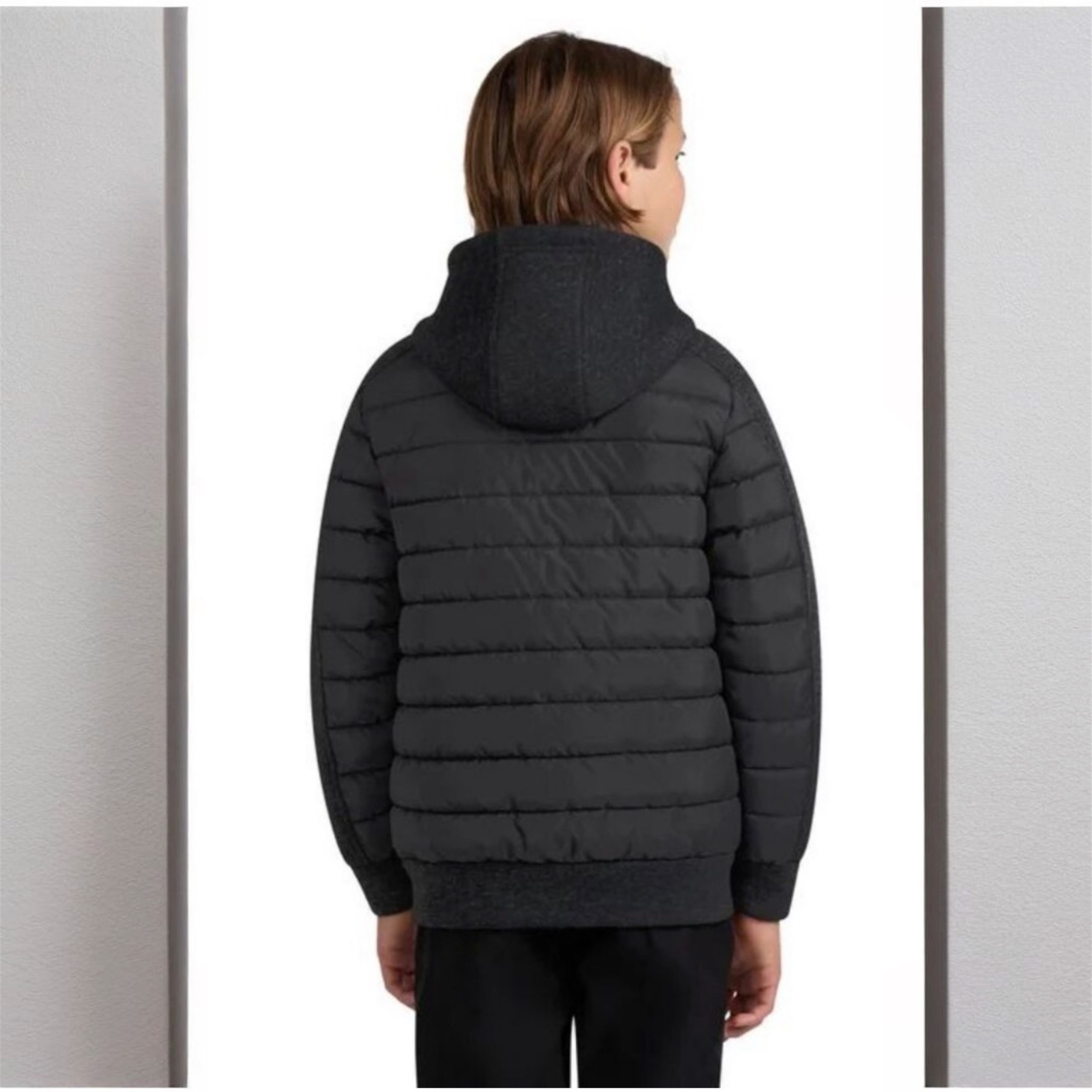 Stylish black and gray hooded jacket. Features front zipper and pockets. Comfortable and warm.